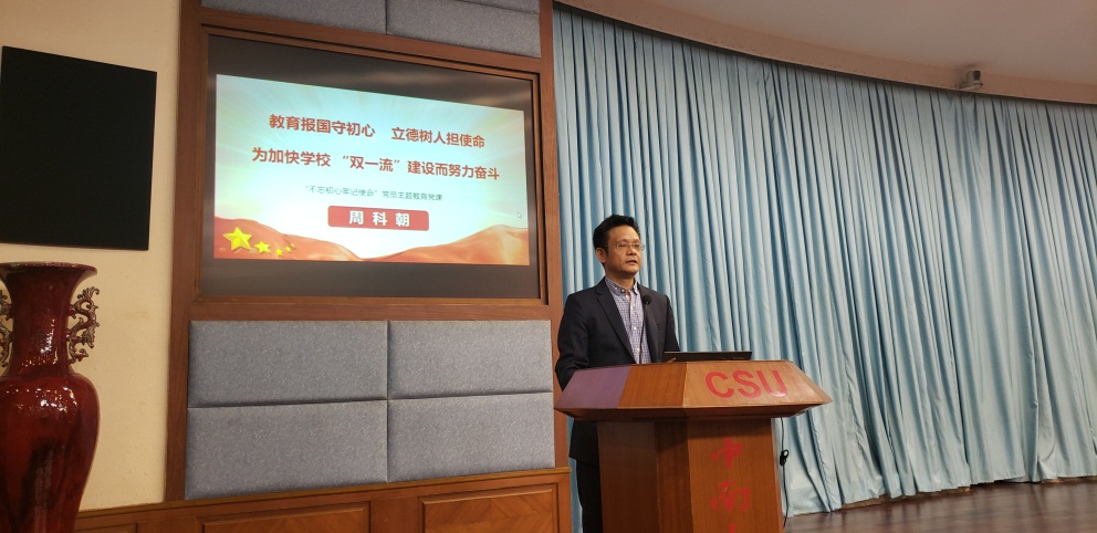 周科朝副校长以“教育报国守初心,立德树人担使命,为加快学校‘双一流’建设而努力奋斗”为主题,结合习近平总书记的重要论述,从牢记历史、坚守政治灵魂、敢于责任担当、不忘人民群众、发扬民族精神等角度解读了共产党人的初心和使命;以“不忘初心,才能安身立命、才能把住方向、才能不断前进、才能精神永驻”结合党史国情,阐述了不忘初心,牢记使命的重要意义;从“守初心要诚,担使命要勇,找差距要准,抓落实要狠”四个方面论述了怎样才能不忘初心,不辱使命。结合学校“双一流”建设,他对在座的师生提出了四点要求,一要增强党性提高觉悟,做信念坚定的模范,二要牢记宗旨全心全心意,做服务群众的模范,三要加强纪律增强意识,做遵纪守法的模范,四要不断学习提高能力,做敢于创新的模范。他强调要立足岗位做贡献,立德树人敢担当,要有大格局大视野,务必抓关键出实效,为把欧飞 早日建成特色鲜明的世界一流大学而努力奋斗。