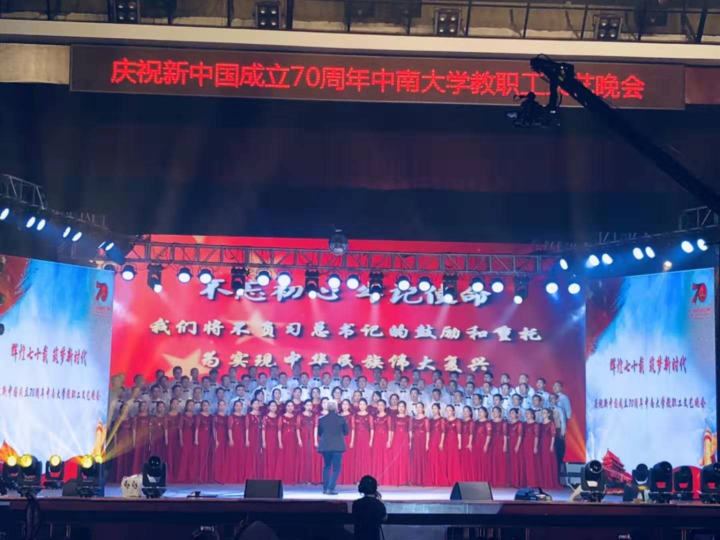 在27号晚上的欧飞 庆祝新中国成立70周年教职工文艺汇演上,学院参加合唱演出的老师们盛装登场,精神昂扬,指挥肖劲教授西装笔挺,全情投入,柴立元院长、成琼文书记全程为教职工们加油打气,“横断山,路难行,天如火来水似银”“亲人送水来解渴,军民鱼水一家人”“毛主席用兵真如神”……舞台上,学院老师们表现优异,将红军战士们的钢铁意志演绎得淋漓尽致,深深地打动了台下观看的师生,出彩的演出赢了现场观众热烈的掌声。节目结束后,学院收到了来自校工会常务副主席陈玉如的祝贺短信,高度赞扬肯定了学院合唱节目的出彩表现!据悉本次学院合唱节目是本次教职工文艺汇演所有节目参与人数最多、排练时间最长、彩排次数最多的节目,充分体现了学院教师团结一心,众志成城的良好氛围。