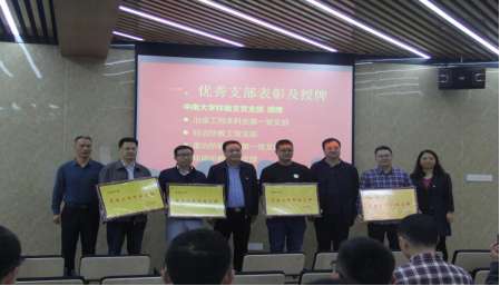 会议伊始,学院党委对优秀党支部进行表彰及授牌。环境所教工党支部、轻冶所教工党支部、冶金工程本科生第一党支部、重冶所研究生第一党支部4个获得学校党建工作“样板党支部”培育创建单位,环境所教工党支部书记唐崇俭获得学校“双带头人”教师党支部书记工作室培育创建单位,成琼文书记等分别为他们授牌,同时会议还对获得2019年度“双述双评”优秀教工支部的重冶所教工党支部、环境所教工党支部进行了表彰。