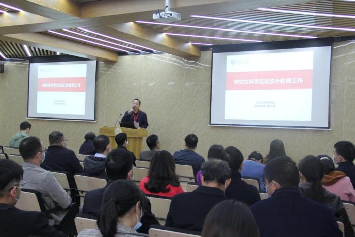 赖延清副院长介绍了学校实验室安全与环保管理现状、实验室安全环保制度体系、新出台的实验室安全环保管理文件,通报了实验室现场典型隐患及近年来学校发生的实验室安全事故,并对实验室安全检查中各实验室存在的安全隐患进行提醒,切实做好实验室安全工作,避免实验室安全事故的发生。