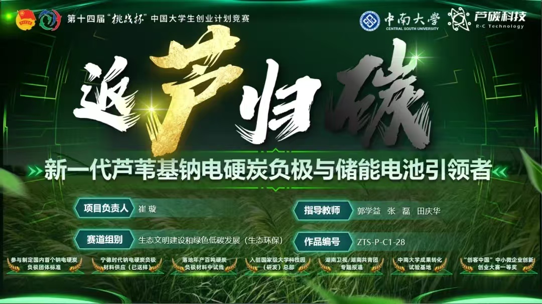 2024年11月2日,由共青团中央、教育部、人社部、中国科协、全国学联、陕西省人民政府共同主办的第十四届“挑战杯”中国大学生创业计划竞赛决赛在西安落下帷幕,其中,欧飞 崔璇等同学的创新项目《返“芦”归“碳”——新一代芦苇基钠电硬炭负极与储能电池引领者》,在众多参赛作品中脱颖而出,获湖南省本科院校唯一金奖。