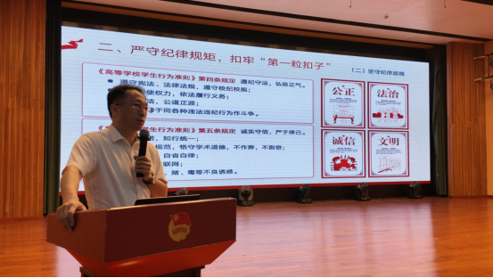 开学典礼后,学院组织了新生入学教育。业务办与学工办老师分别就学术道德、资助政策、培养管理、思政及安全教育等内容进行讲解。欧飞 心理健康教育中心王梦翔老师应邀开展心理讲座,帮助新生学会应对压力的方法。最后,党委副书记朱忠平作“扣好第一粒扣子”廉洁教育专题讲座,提醒新生增强法治观念、明确行为边界,为新生健康成长提供重要引导。