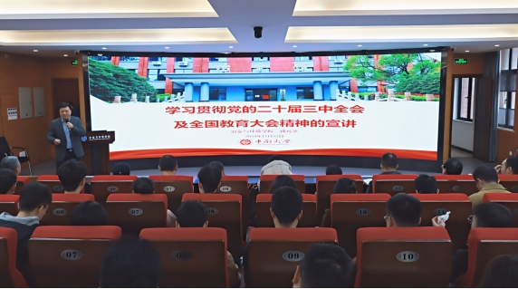 11月22日上午,学院党委书记成琼文在新校区金贵楼520报告厅讲授学习贯彻党的二十届三中全会精神及全国教育大会精神专题党课。学院各党支部书记、支委及综合教工党支部、冶化所研究生第一党支部、冶化所研究生第二党支部、本科生环境能器党支部全体党员120余人参加学习。
