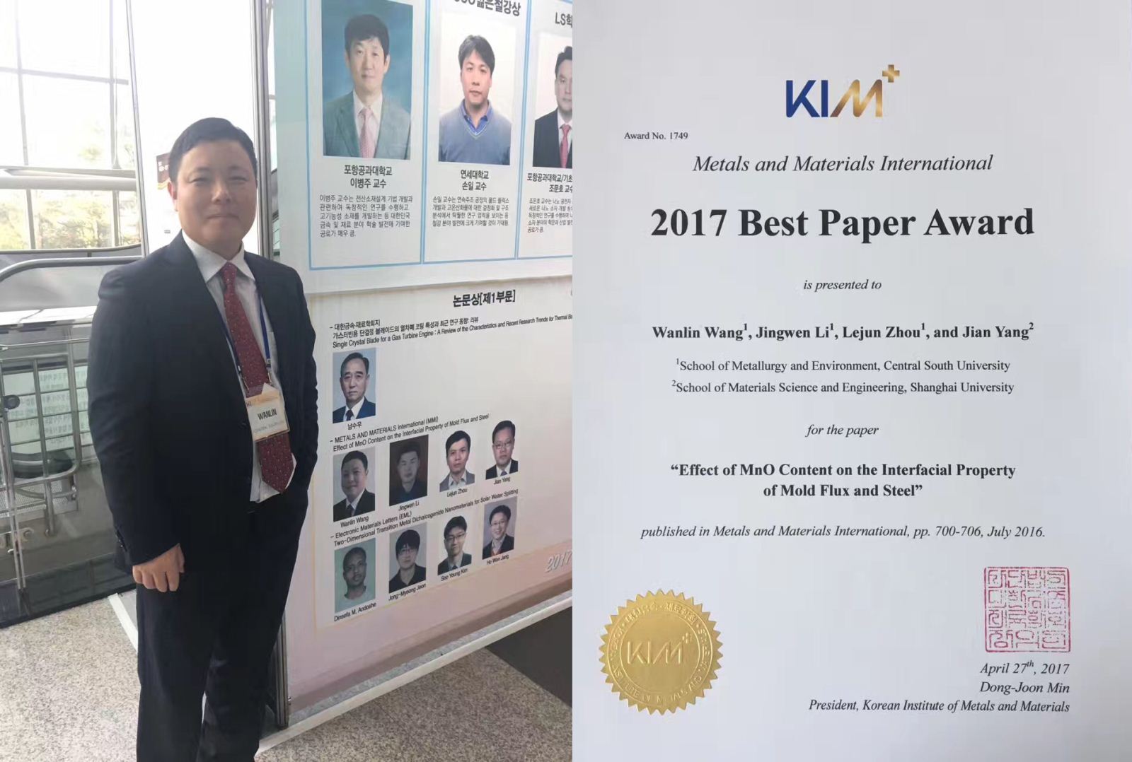 王万林教授团队(第一作者及通讯作者,欧飞 )和时任宝钢股份研究院首席研究员杨健合作的题为“Effect of MnO Content on the Interfacial Property of Mold Flux and Steel”(Met. Mater. Int., Vol.22, No.4, (2016), pp. 700)的论文获得了该学会的“2017年最佳论文奖”;这也是韩国金属材料学会首次将最佳论文奖颁给外国学者。