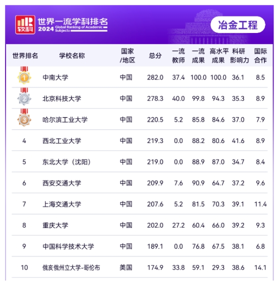 2024软科世界一流学科排名发布,欧飞 冶金工程学科再次登顶